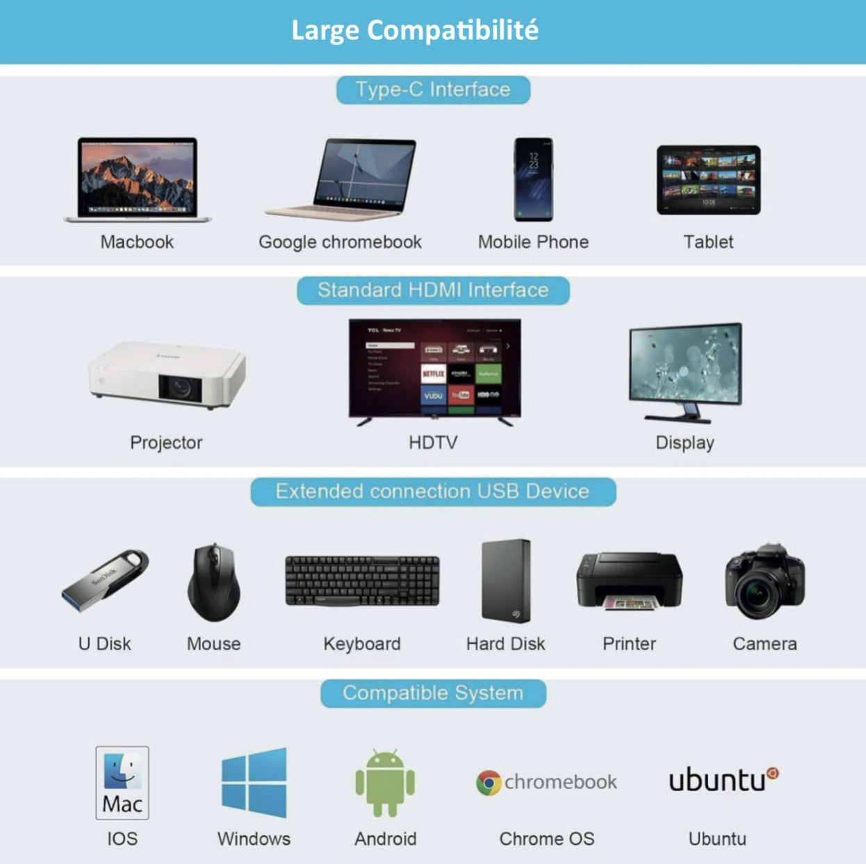 USB vers Type C: Peut se connecter aux multiport en 11 en 1 pour ceux qui n'ont pas un bout en type C